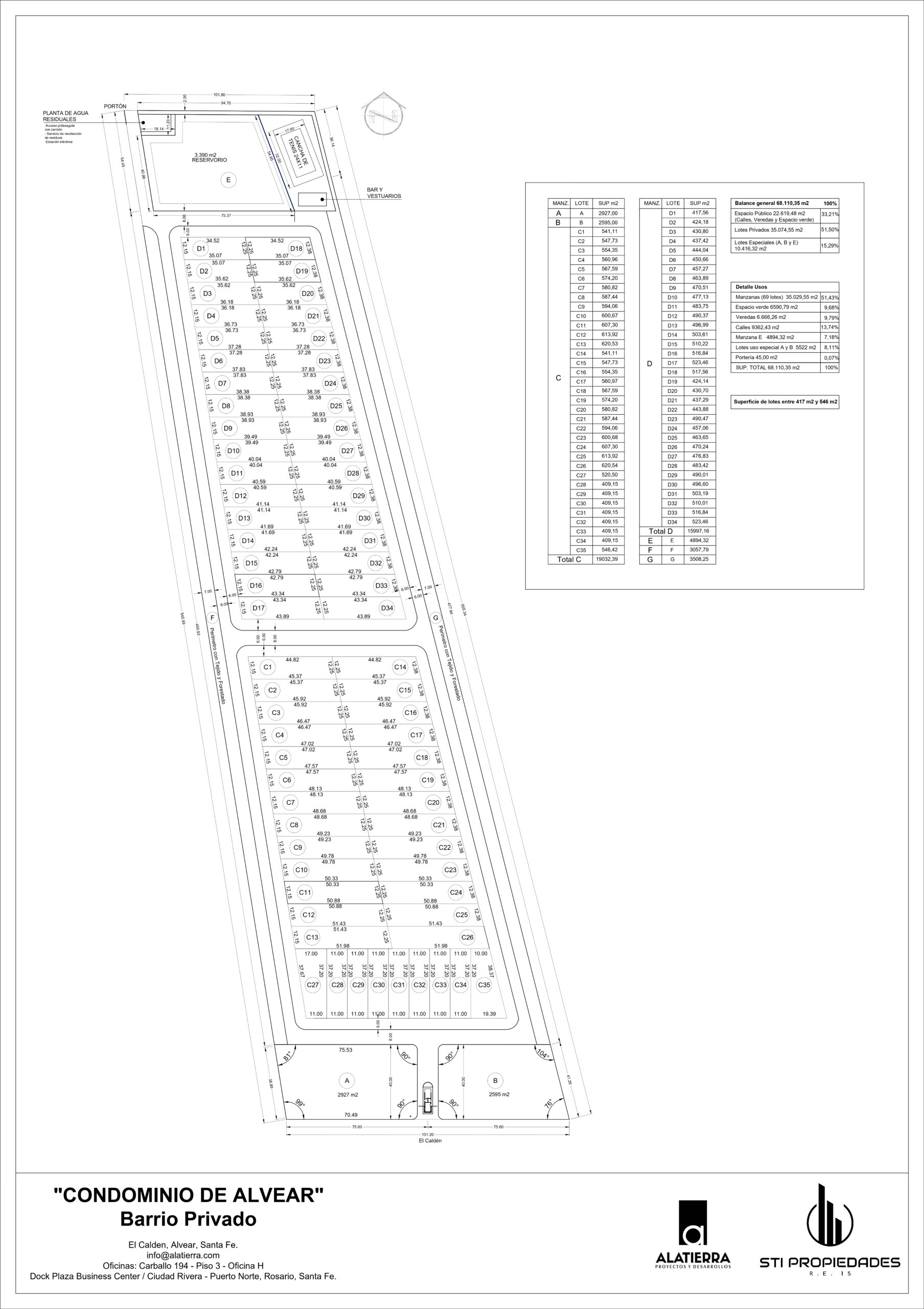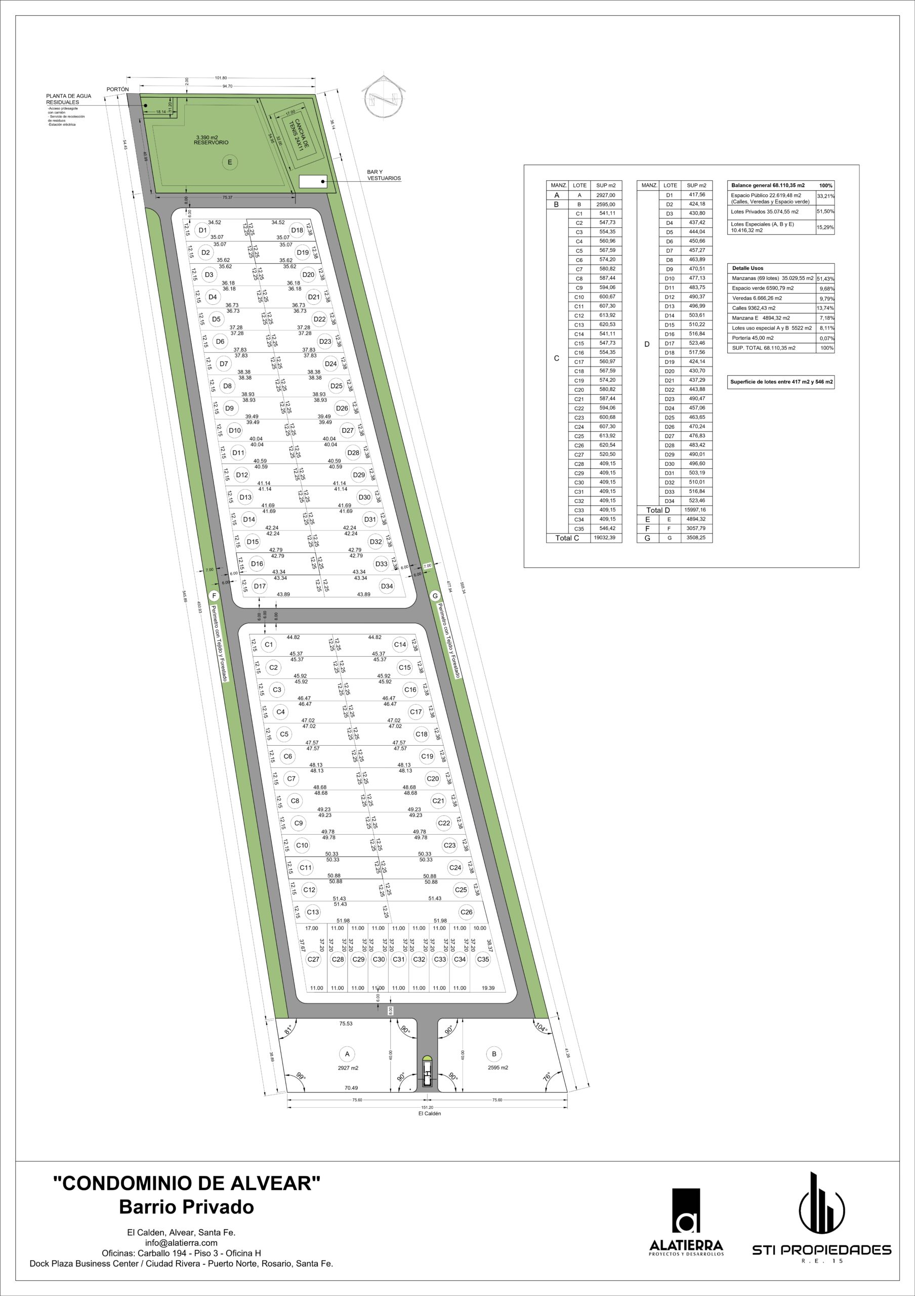 CONDOMINIO DE ALVEAR es un Proyecto de Urbanización de tipo Barrio Cerrado Residencial compuesto por 69 lotes desde 420 a 620 m2 destinados a vivienda, distribuidos en una diagramación sencilla donde todas las unidades se plantean con vista panorámica al GREEN RIDE (paseo verde con circuito aeróbico) combinado con una amplia forestación de diversas especies y parquización de primer nivel; REST AREA (áreas de descanso y esparcimiento); GYM (área de entrenamiento localizado); SPORT ZONE (Campo de fútbol y tenis); SOCIAL HOUSE (ubicado en la zona de deportes con bar y vestuarios) y MULTIPURPOSE ROOM (ubicado al ingreso) destinado a reuniones de negocios y otros.